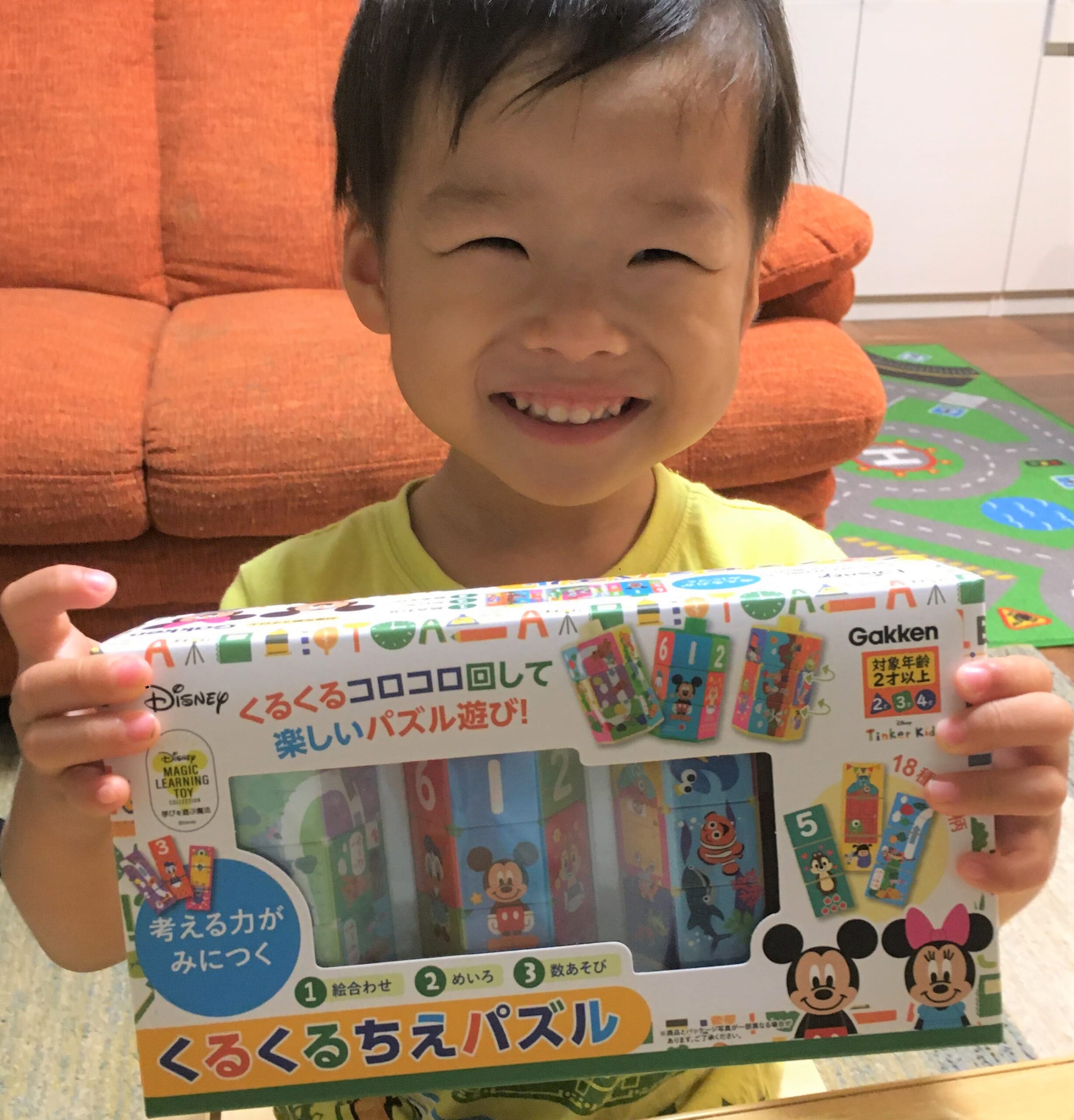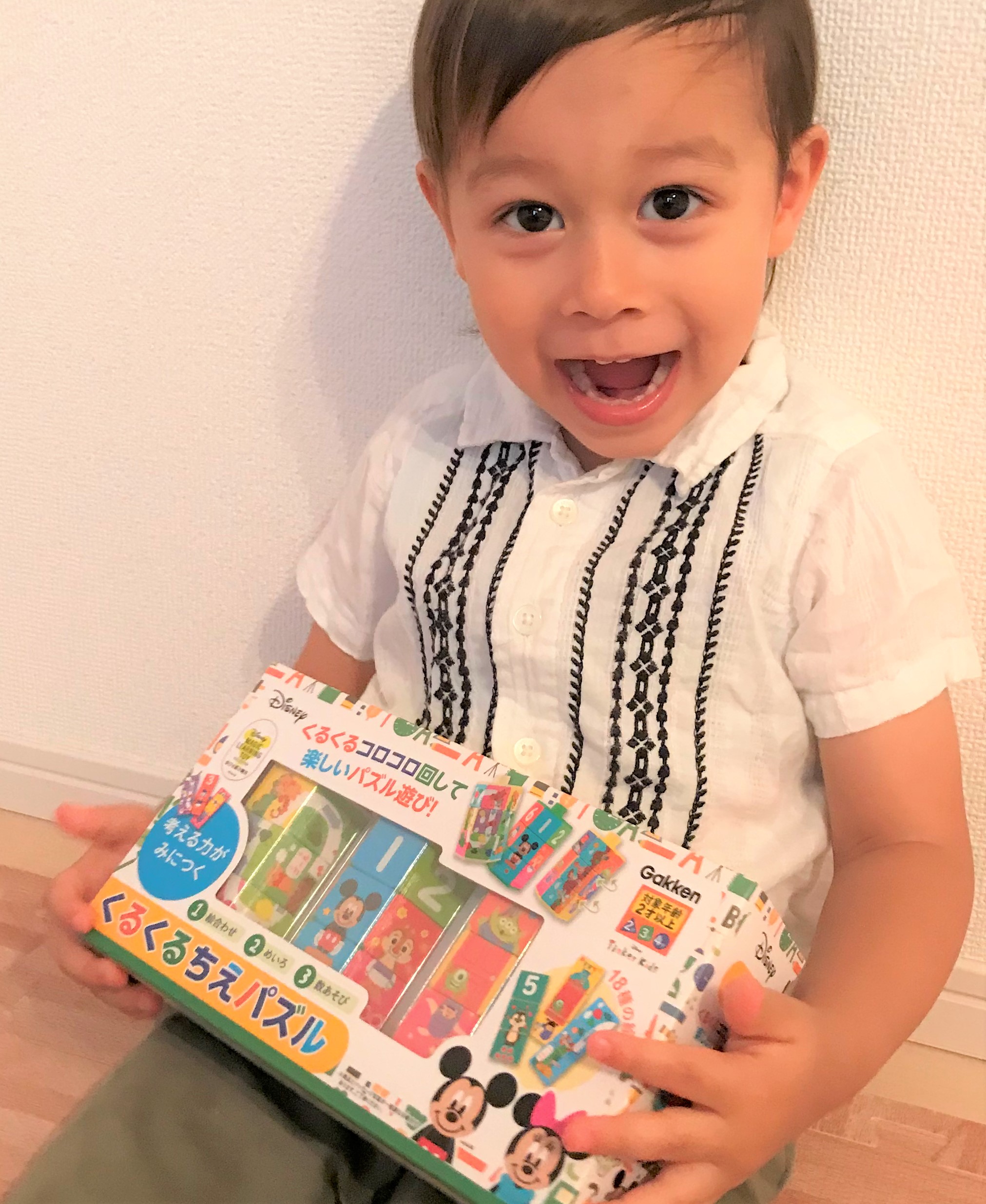 もう1人、男の子のおうちにも「くるくるちえパズル」をおとどけ! 元気いっぱいなアレックスくんは、ディズニーキャラクターが大好き。「ミッキーだ!」と大はしゃぎです。キャラクターの名前をとなえながら、くるくるとパズルをむ中で回し始めました。回しているうちに、知っているキャラクターのパズルが合っていくことに気づいたアレックスくん。わざとちがうキャラクターを組み合わせたりして、そのたびに「見てみてー!」と、着せかえのように楽しんでいました。