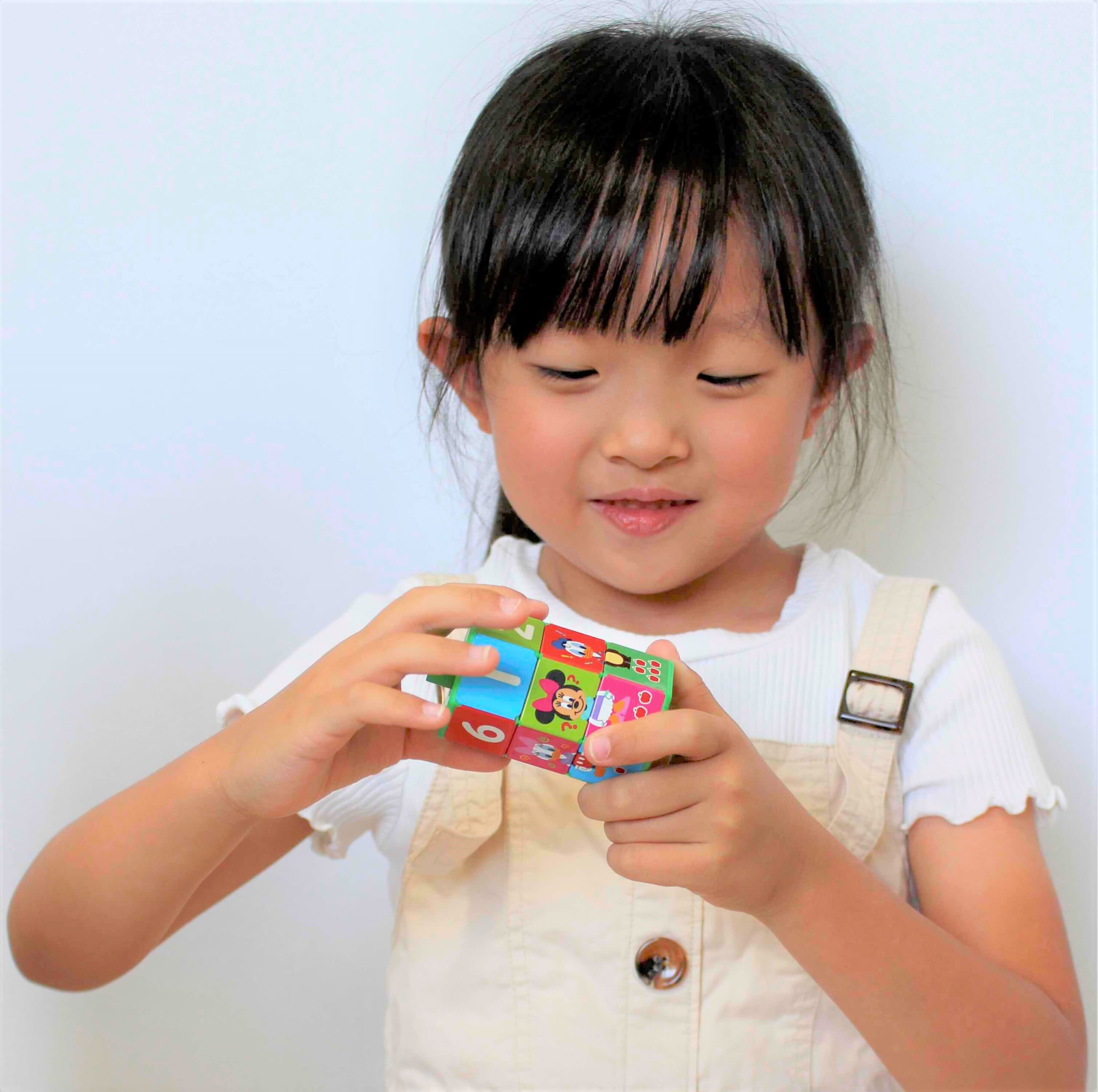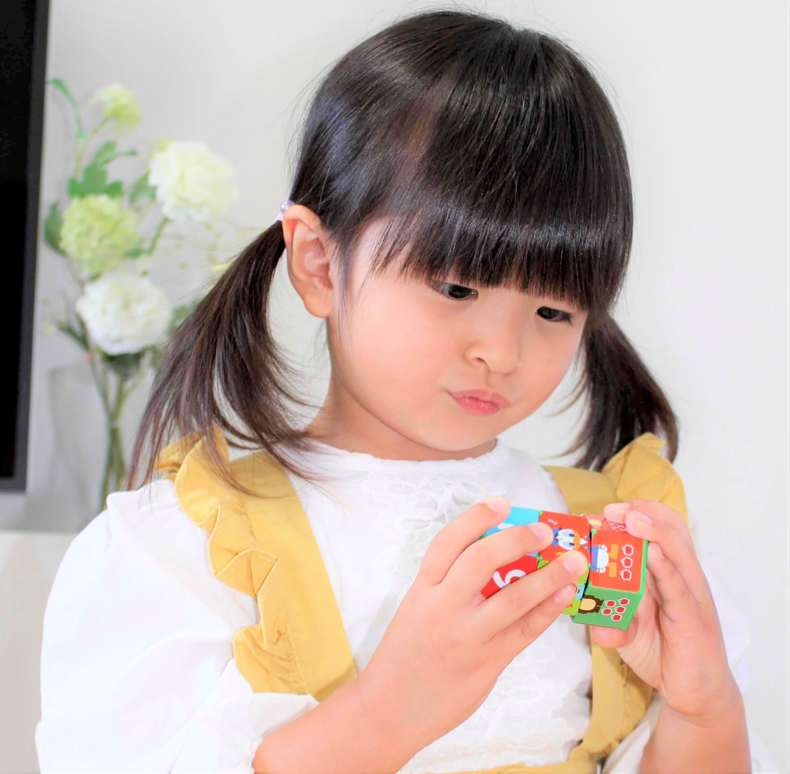 3つのキューブをくるくるコロコロと回し、楽しく遊びながら絵や数を合わせることで、