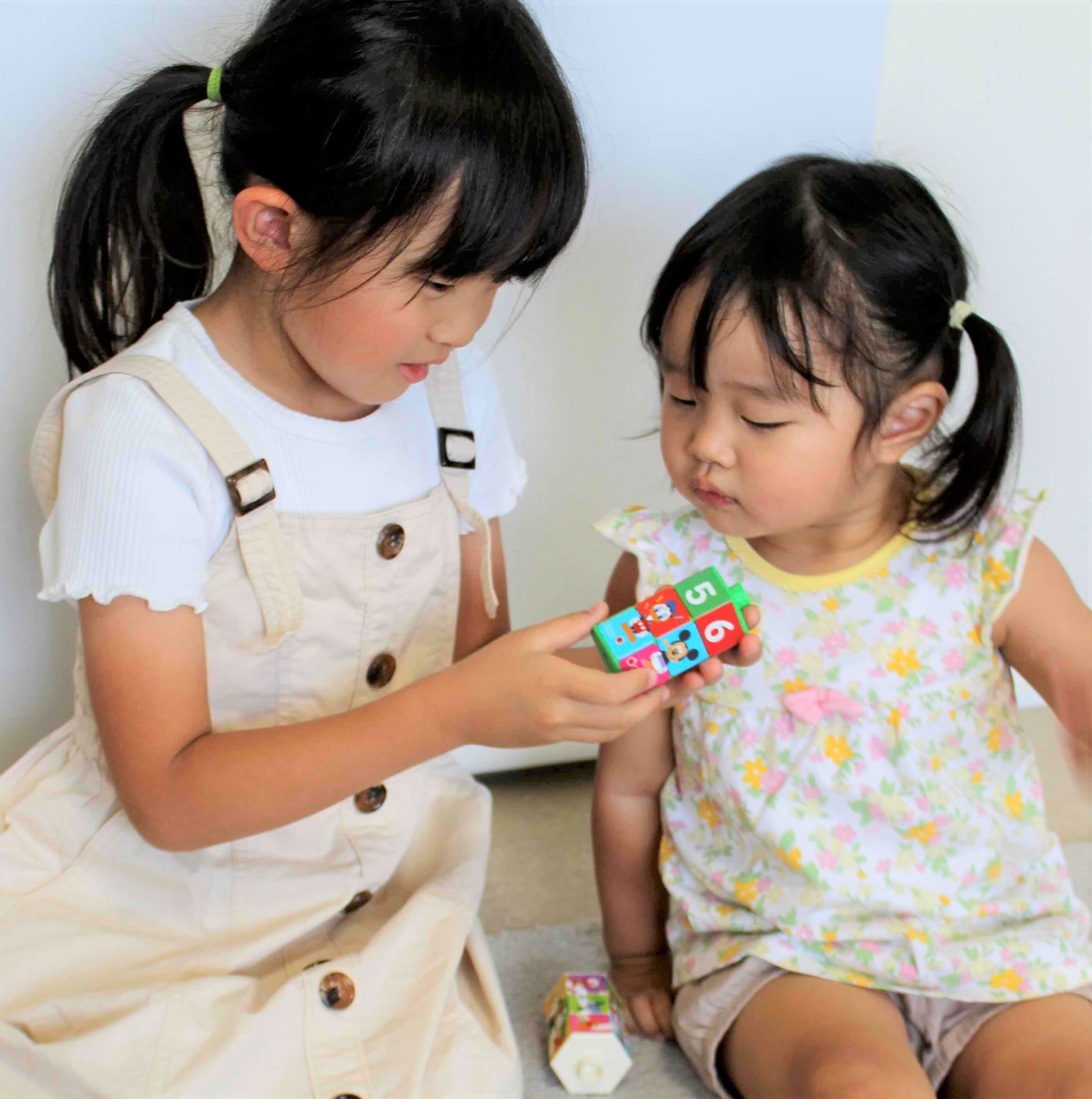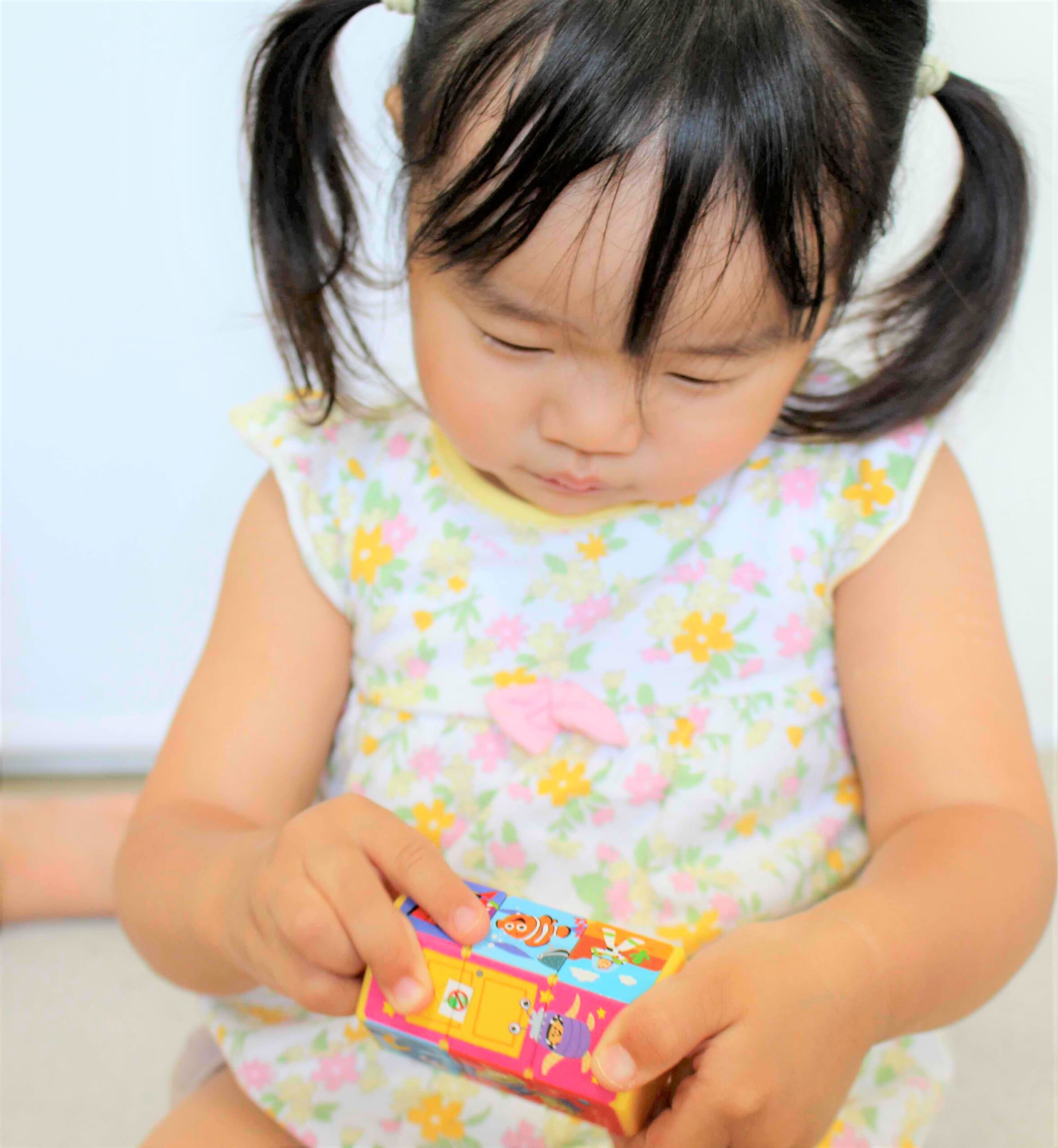 女の子3姉妹にも、「くるくるちえパズル」を試してもらいました! 一番上のお姉ちゃん・みつきちゃん(5歳)は、こうきしんいっぱい。真ん中・いちかちゃん(4歳)は、やさしくてマイペース。3番目のこゆきちゃん(2歳)は、いつでも自由で、なんと2歳にしてお世話するのが大好き! それぞれキャラクターのちがう3姉妹も「くるくるちえパズル」の箱を見るや、「これ、なぁに〜?!」「わ〜! かわいい!」「開けて、開けて〜!」とみんな大はしゃぎだったそう。3姉妹のママ・みーるさんによると、いつもは1つのおもちゃをシェアして遊ぶことは少ないそうですが、「くるくるちえパズル」は、3人そろって楽しそうに遊び、お姉ちゃんが妹に遊び方を教えてあげる様子も見られました。