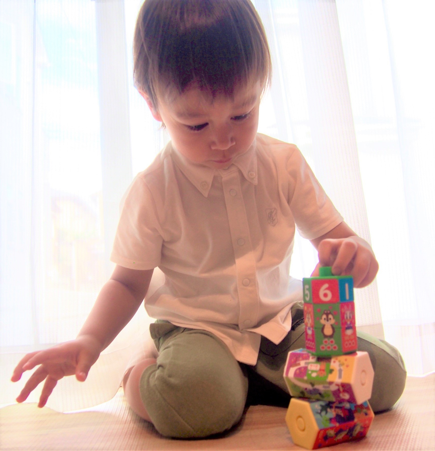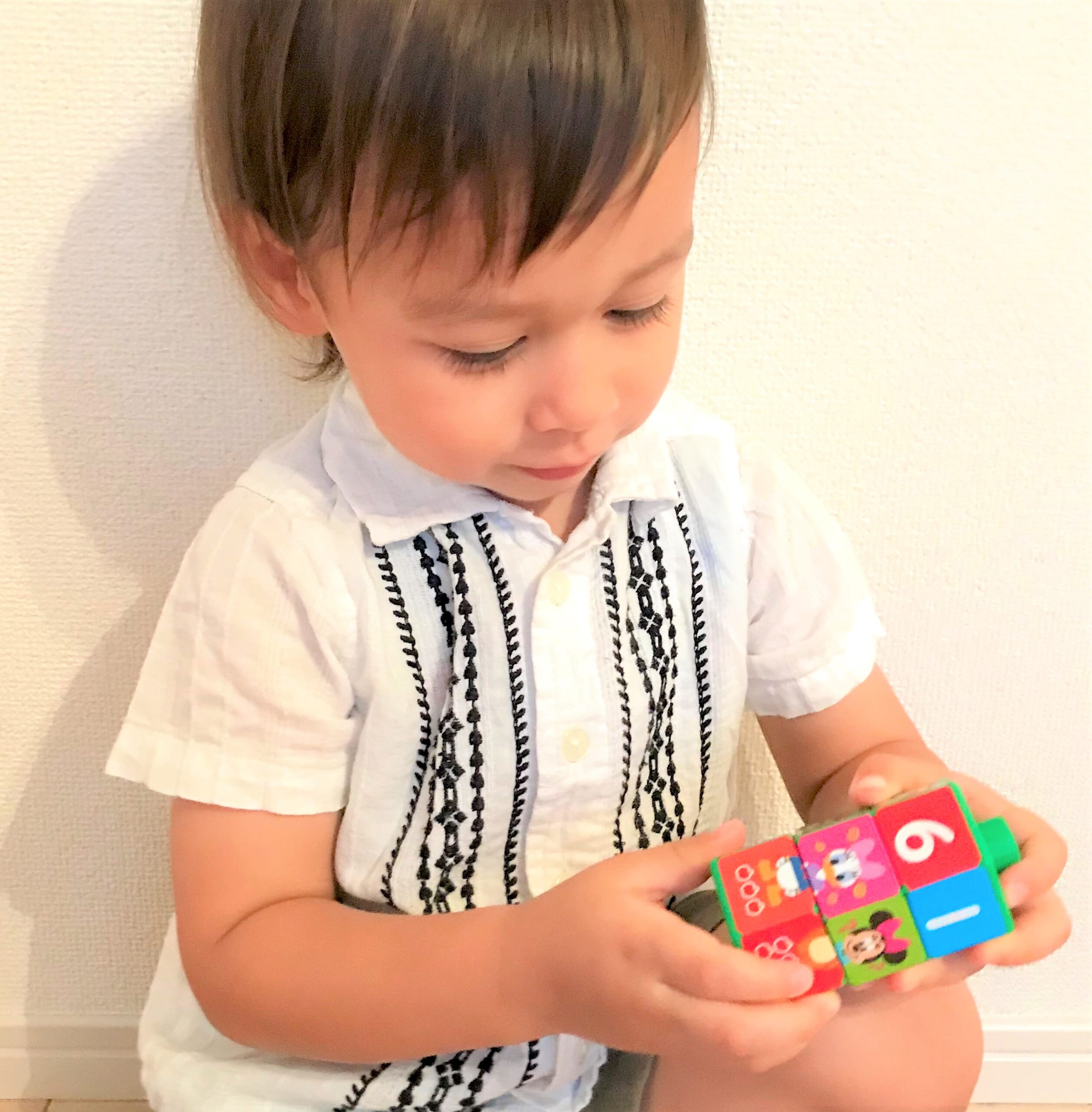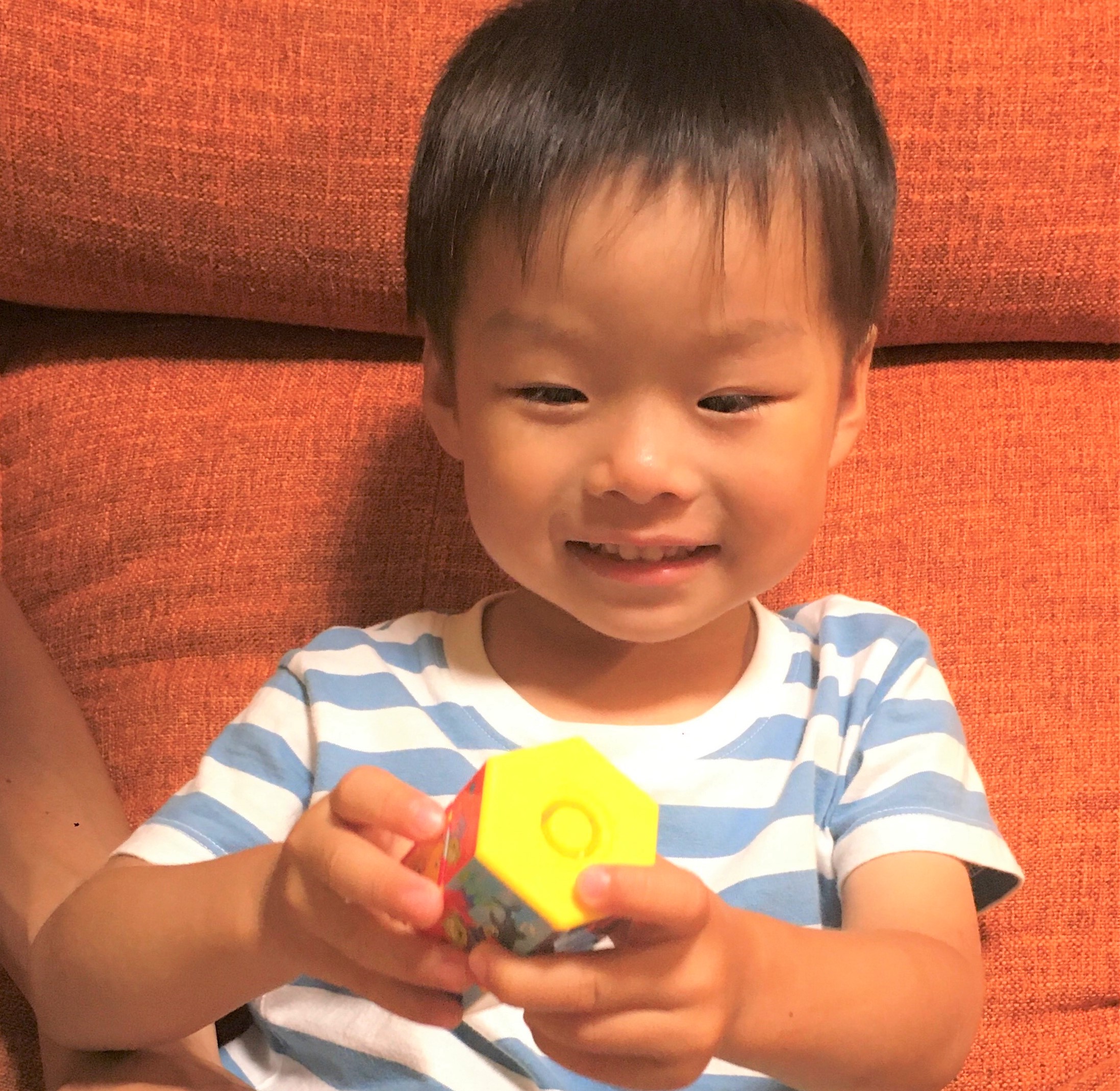 元気なアレックスくんは、3つのキューブを重ねてぼうのようにしてふってみたり、はしっこを口にくわえて、笛のように音を出してみたり。ママは「この遊び方は正しくないなあ」と心配しつつも、アレックスくんがとても楽しそうに遊んでいるのをほほえましく見ていたそうです。持ち運びやすいサイズであるのも、外遊びが大好きなアレックスくんのお気に入りポイントです。