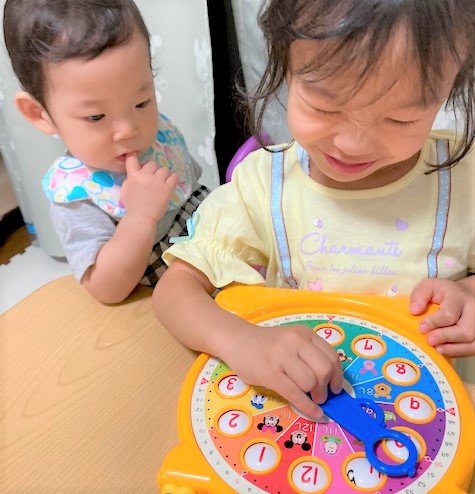 姉妹のママ・かりんとママさんによると、ゆうちゃんは、「ママ見てー! ゆうちゃんすごいでしょ!」とよく言ったり、みんなを笑わせることが大好きな、元気いっぱいなお子さんだそうです。この時も「これ、とけいだよね? どうやってあそぶの? 早くあそびたい!」さっそくきょう味しんしんです!