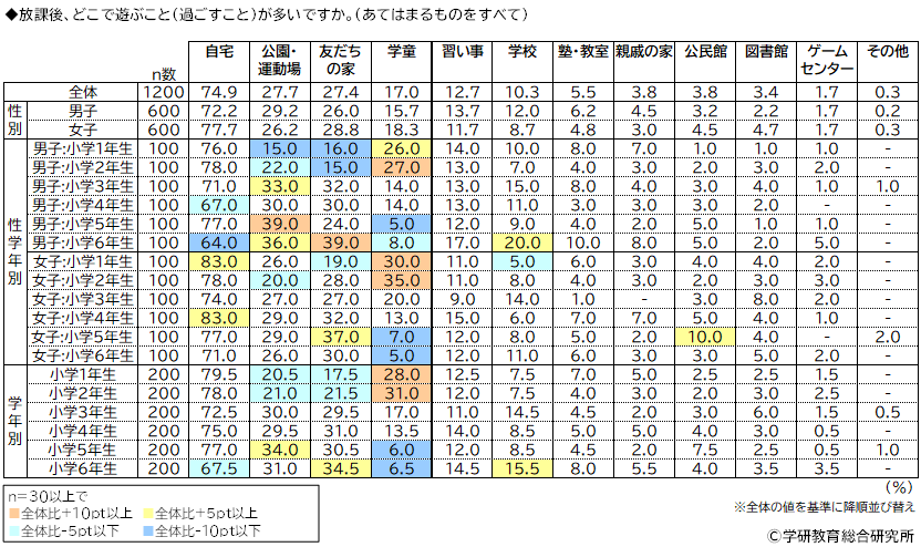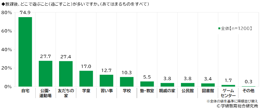 放課後、どこで遊ぶこと(過ごすこと)が多いかをきいたところ、「自宅」(74.9%)が突出して高くなり、「公園・運動場」(27.7%)、「友だちの家」(27.4%)、「学童」(17.0%)、「習い事」(12.7%)と続きました。 学年別にみると、1年生と2年生では「学童」が2位でした。