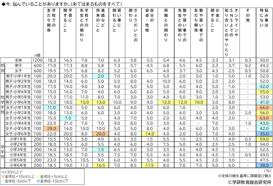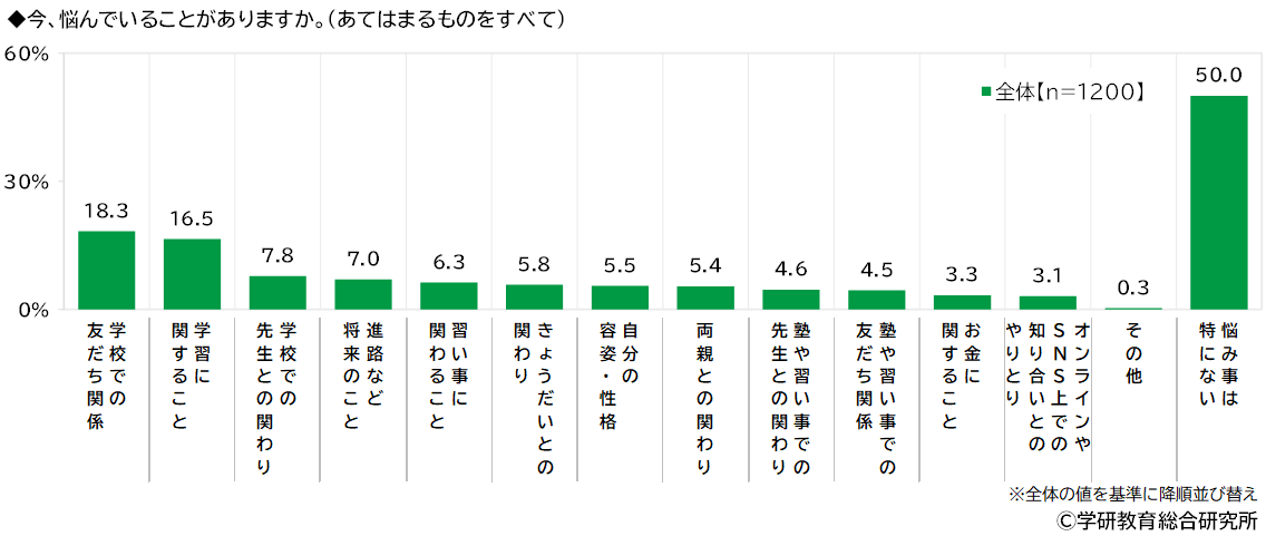 今、悩んでいることがあるかをきいたところ、1位「学校での友だち関係」(18.3%)、2位「学習に関すること」(16.5%)、3位「学校での先生との関わり」(7.8%)となり、「悩み事は特にない」は50.0%、悩み事がある人の割合は50.0%でした。 男女・学年別にみると、悩み事がある人の割合が最も高くなったのは6年生の女子(65.0%)でした。