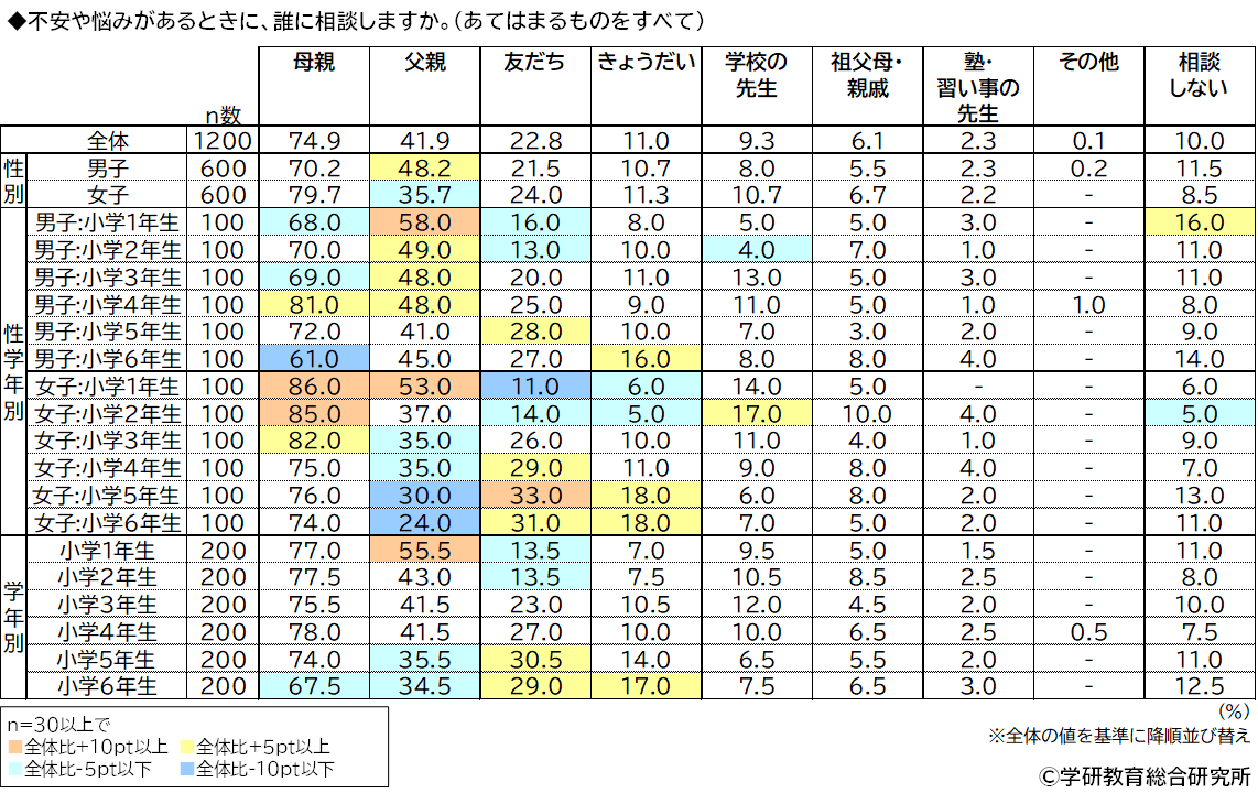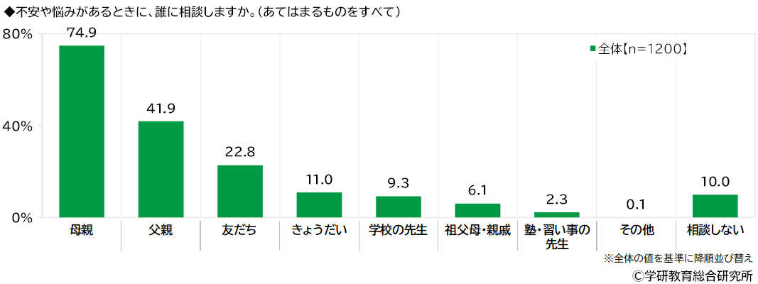 不安や悩みがあるときに、誰に相談するかをきいたところ、「母親」(74.9%)が突出して高くなりました。次いで高くなったのは、「父親」(41.9%)、「友だち」(22.8%)でした。また、「相談しない」は10.0%、相談する人の割合は90.0%となりました。 学年別にみると、1年生では「父親」(55.5%)が他の学年より高くなりました。