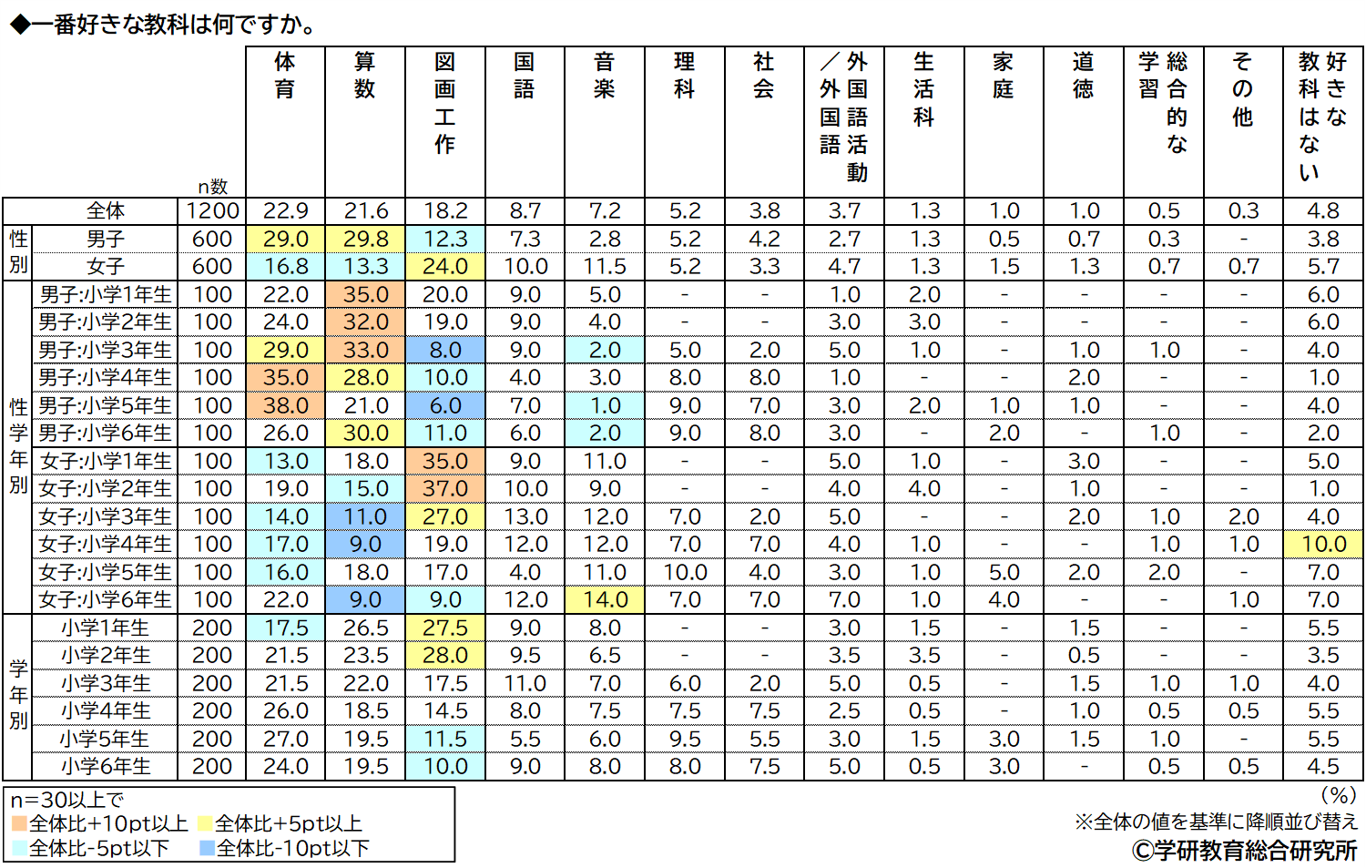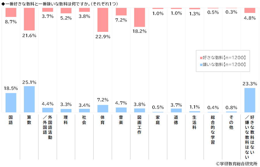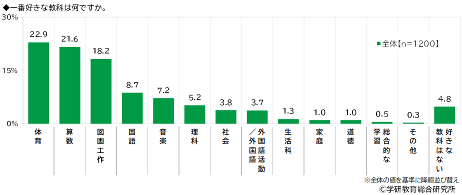 一番好きな教科をきいたところ、1位「体育」(22.9%)、2位「算数」(21.6%)、3位「図画工作」(18.2%)、4位「国語」(8.7%)、5位「音楽」(7.2%)となりました。