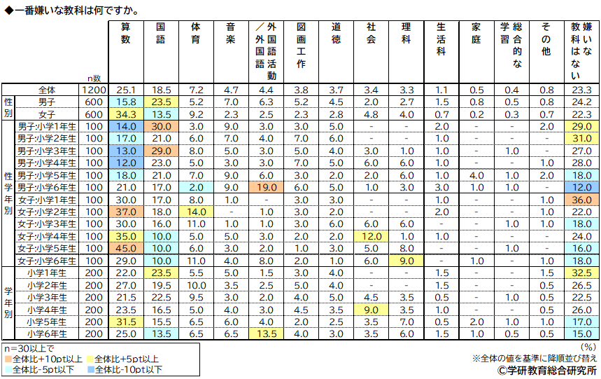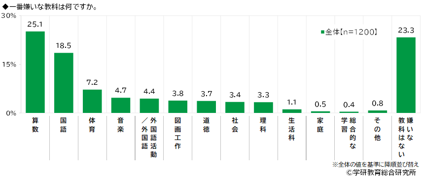 他方、一番嫌いな教科をきいたところ、1位の「算数」(25.1%)、2位の「国語」(18.5%)が突出して高くなりました。以降、3位「体育」(7.2%)、4位「音楽」(4.7%)、5位「外国語活動/外国語」(4.4%)となりました。