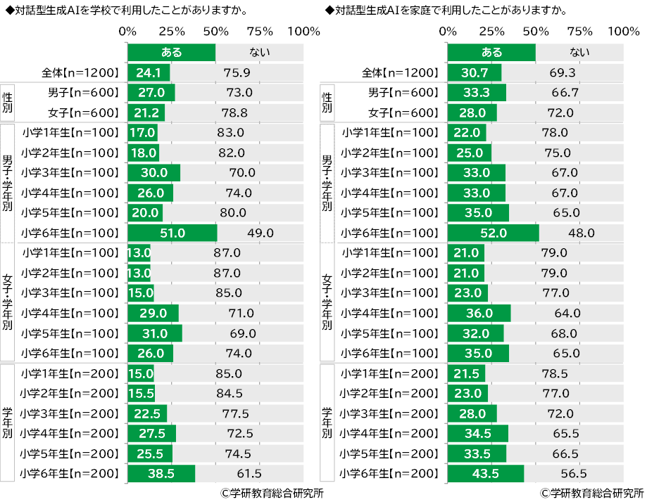 ChatGPTなどの対話型生成AIを【学校】で利用したことがあるかをきいたところ、「ある」は24.1%となりました。また、対話型生成AIを【家庭】で利用したことがあるかをきいたところ、「ある」は30.7%となりました。