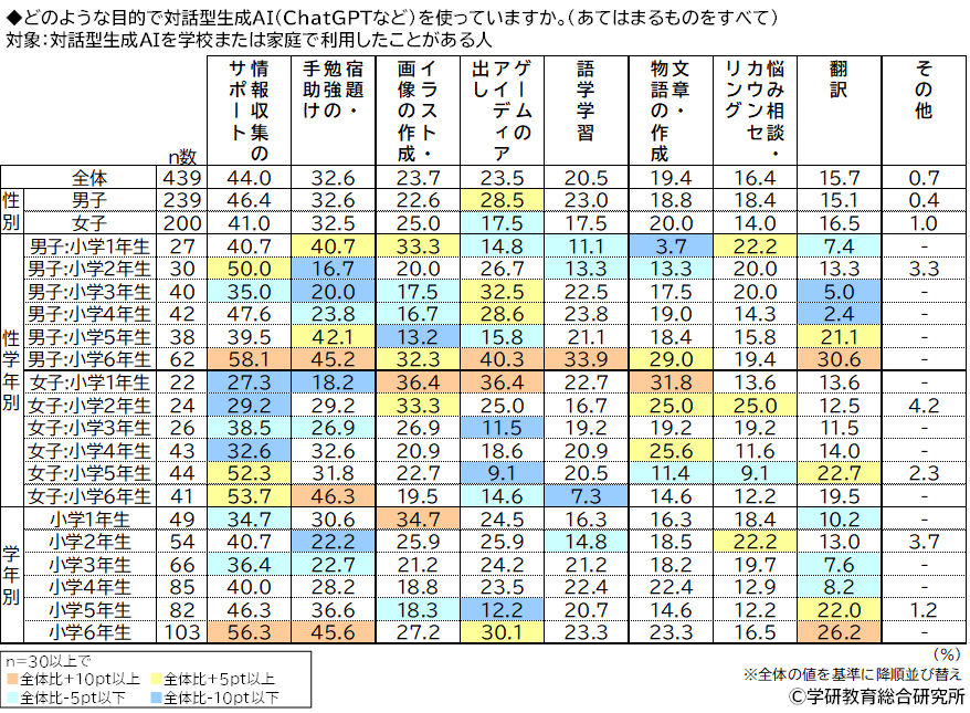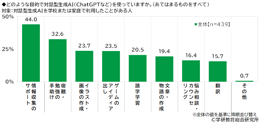 対話型生成AIを学校または家庭で利用したことがある人(439名)に、どのような目的で対話型生成AIを使っているかをきいたところ、「情報収集のサポート」(44.0%)が最も高くなり、次いで、「宿題・勉強の手助け」(32.6%)、「イラスト・画像の作成」(23.7%)、「ゲームのアイディア出し」(23.5%)、「語学学習」(20.5%)となりました。