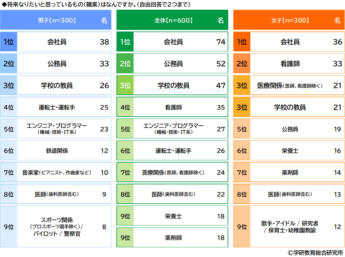 女子についてみると、男子と同様に1位は「会社員」(36名)となり、2位「看護師」(33名)、3位「医療関係(医師、看護師除く。助産師や歯科衛生士など)」「学校の教員」(いずれも21名)となりました。
