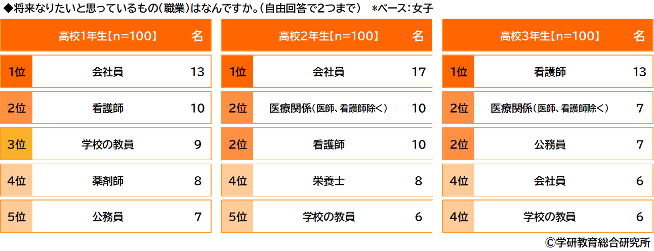 女子について、学年別にみると、1年生と2年生では「会社員」が1位、3年生では「看護師」が1位でした。また、2年生と3年生では2位に「医療関係」が挙がりました。