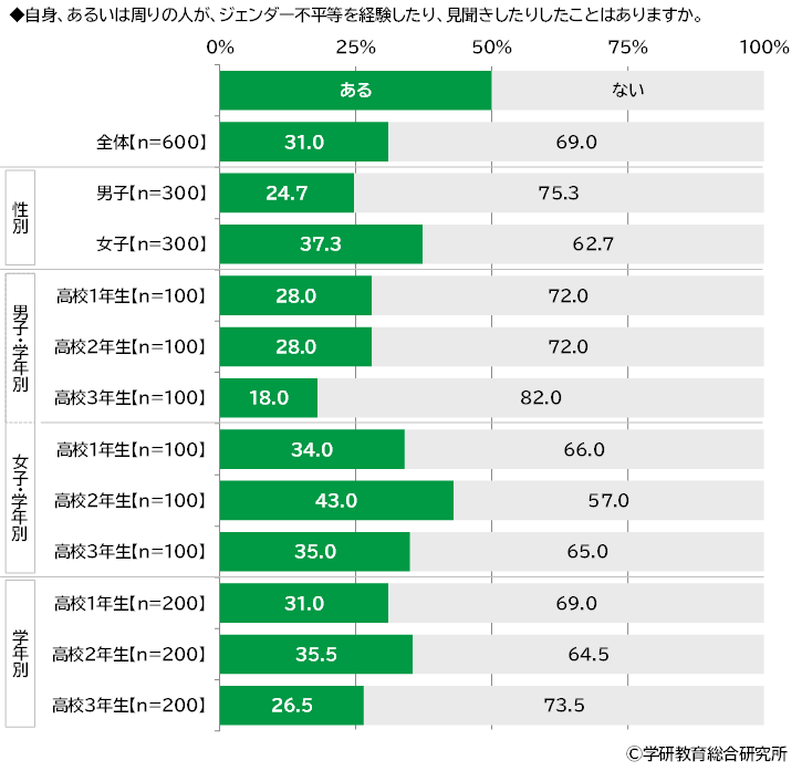 自身、あるいは周りの人が、ジェンダー不平等を経験したり、見聞きしたりしたこと(「女の子だから〇〇すべきだ/〇〇してはならない」と言われた・言われているのを見聞きした、「男の子だから〇〇だ/〇〇してはならない」と言われた・言われているのを見聞きした、性別を理由に進路や選択肢が制限されたと感じたなど)はあるかをきいたところ、「ある」は31.0%、「ない」は69.0%となりました。
