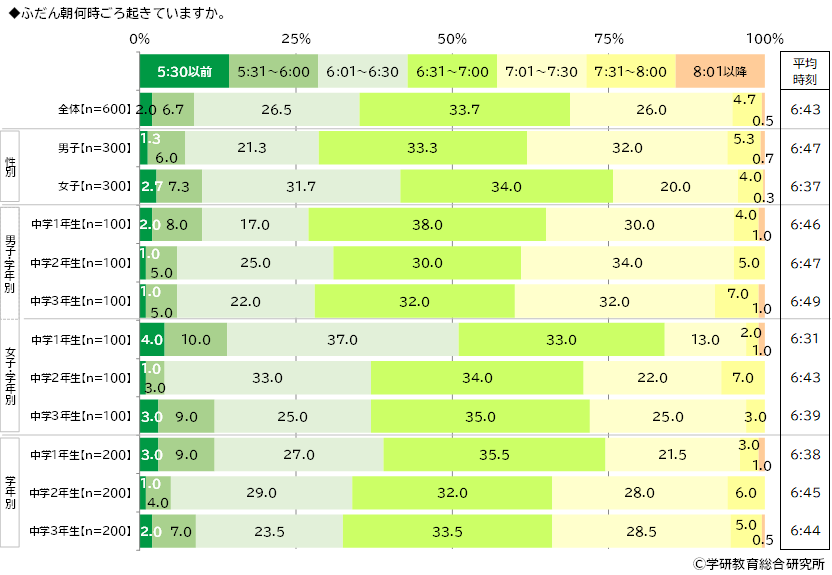 ふだん朝何時ごろ起きているかをきいたところ、「6:01~6:30」(26.5%)や「6:31~7:00」(33.7%)、「7:01~7:30」(26.0%)に回答が集まり、平均時刻は6:43でした。
