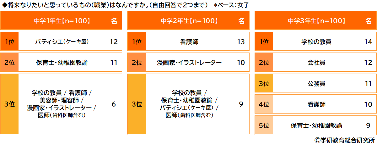 女子について、学年別にみると、1年生では「パティシエ」、2年生では「看護師」、3年生では「学校の教員」が1位となりました。また、1年生と2年生では「漫画家・イラストレーター」がTOP3に挙がりました。3年生では「公務員」が3位となりました。
