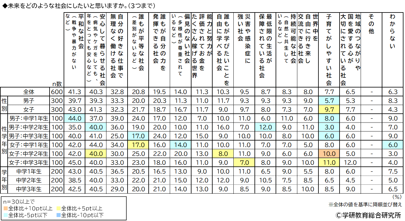 男女・学年別にみると、2年生以上の男子と1年生の女子では「安心して暮らせる社会」が1位でした。