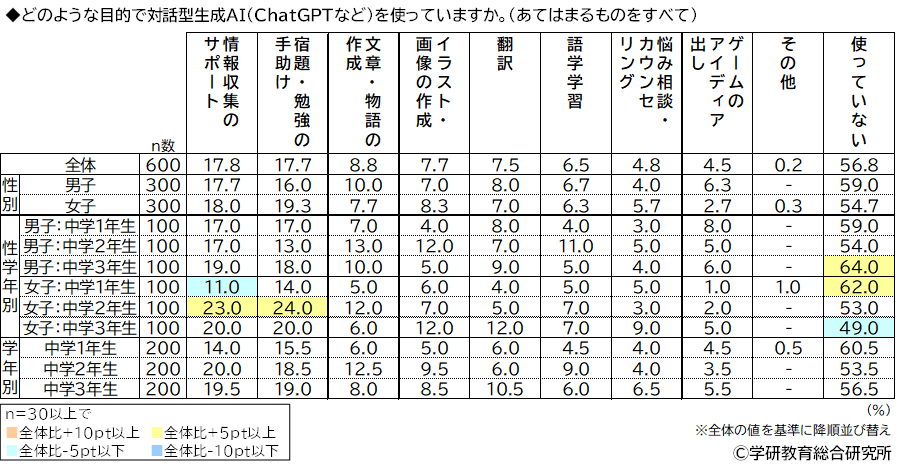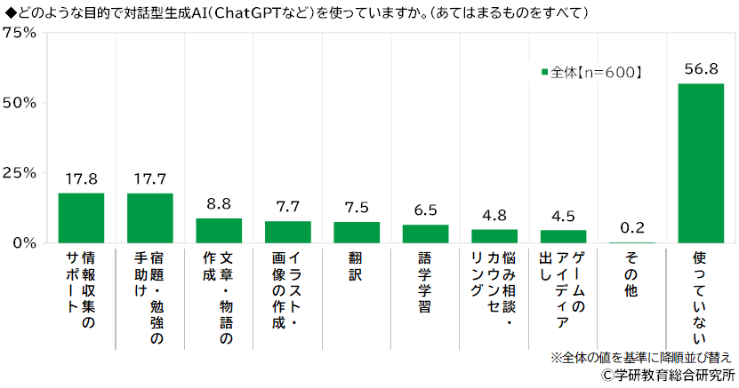 どのような目的で対話型生成AIを使っているかをきいたところ、「情報収集のサポート」(17.8%)、「宿題・勉強の手助け」(17.7%)に回答が集まり、「文章・物語の作成」(8.8%)、「イラスト・画像の作成」(7.7%)、「翻訳」(7.5%)が続き、「使っていない」が56.8%で、使っている人の割合は43.2%となりました。