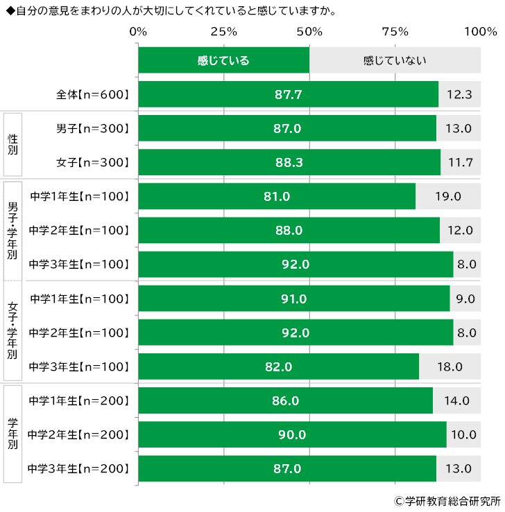 自分の意見をまわりの人が大切にしてくれていると感じているかをきいたところ、「感じている」は87.7%、「感じていない」は12.3%となりました。大多数が自分の意見が尊重されていることを実感しているようです。