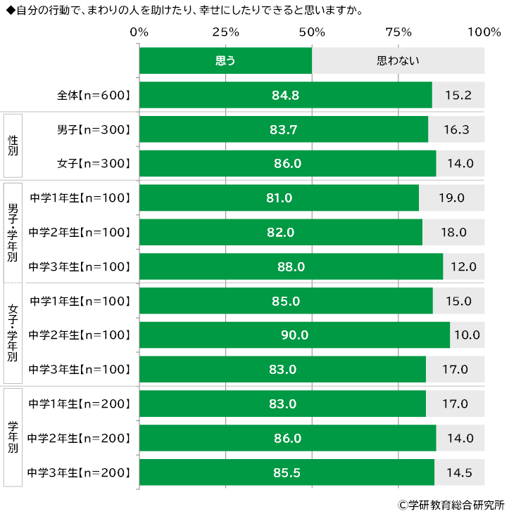 自分の行動で、まわりの人を助けたり、幸せにしたりできると思うかをきいたところ、「思う」は84.8%、「思わない」は15.2%となりました。 学年別にみると、「思う」と回答した人の割合は2年生(86.0%)が最も高くなりました。