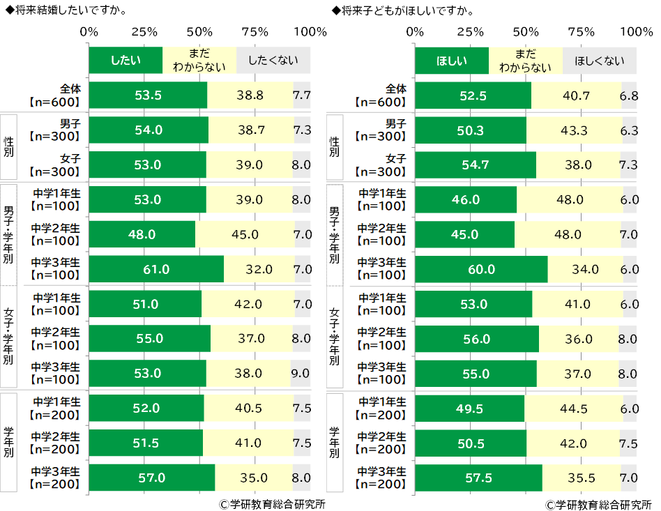 将来結婚したいかをきいたところ、「したい」は53.5%、「まだわからない」は38.8%、「したくない」は7.7%となりました。