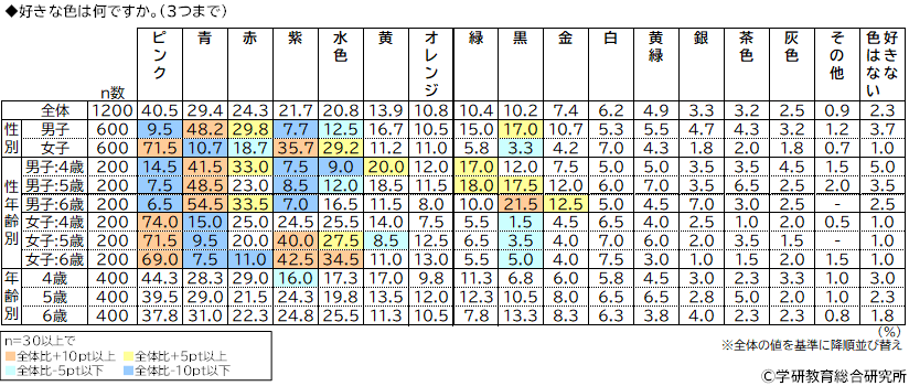 男女別にみると、男子では1位「青」、2位「赤」、3位「黒」、女子では「ピンク」が突出して高く1位となり、2位が「紫」、3位が「水色」でした。