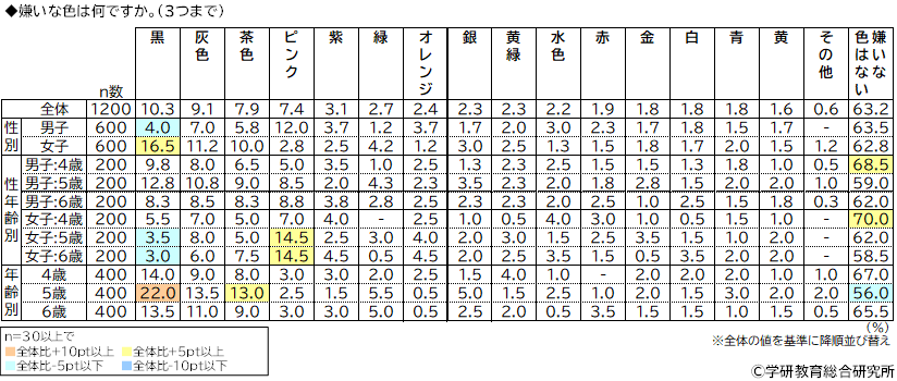 他方、嫌いな色をきいたところ、1位「黒」(10.3%)、2位「灰色」(9.1%)、3位「茶色」(7.9%)となった一方、「嫌いな色はない」が63.2%で突出しました。