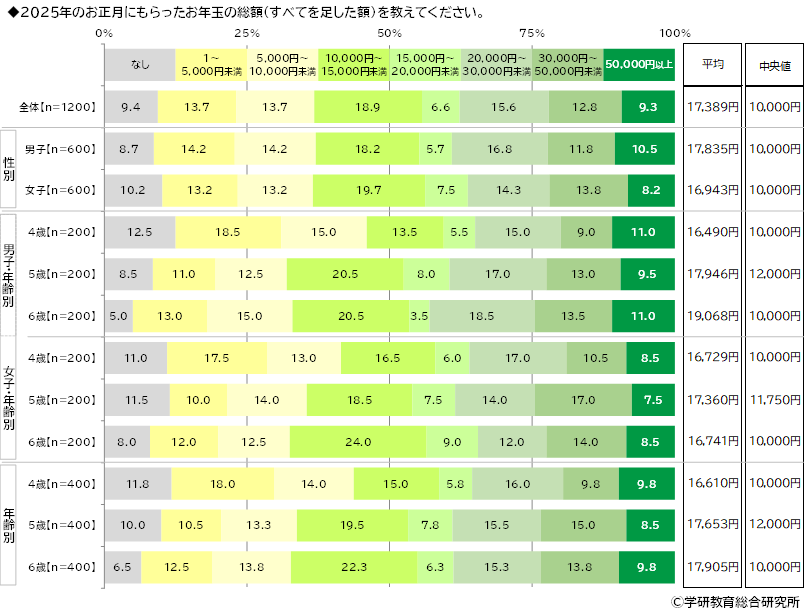 2025年のお正月にもらったお年玉の総額(すべてを足した額)をきいたところ、お年玉をもらった人の割合は90.6%(「なし」が9.4%)となり、平均は17,389円でした。