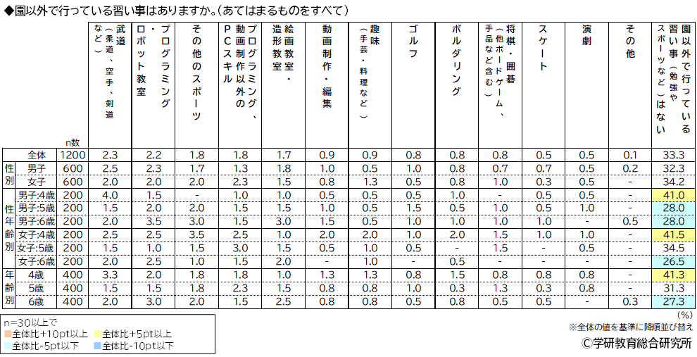 園以外で行っている習い事をきいたところ、1位「水泳」(19.1%)、2位「英語塾(読み書き中心)・英会話教室」(16.6%)、3位「体操教室」(14.3%)、4位「受験のための塾・読む、書くなどの幼児教室(塾)」(9.9%)、5位「通信教育」(8.7%)となりました。また、「園以外で行っている習い事(勉強やスポーツなど)はない」は33.3%でした。